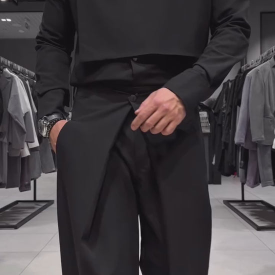 Стилен мъжки комплект в класически черен цвят, изработен от висококачествена материя. Състои се от елегантна риза с прав силует и допълнителен подвижен панел за модерен акцент, както и прав панталон с удобна кройка. Подходящ както за официални, така и за по-ежедневни поводи, този комплект съчетава минимализъм и изтънченост в един завършен вид.