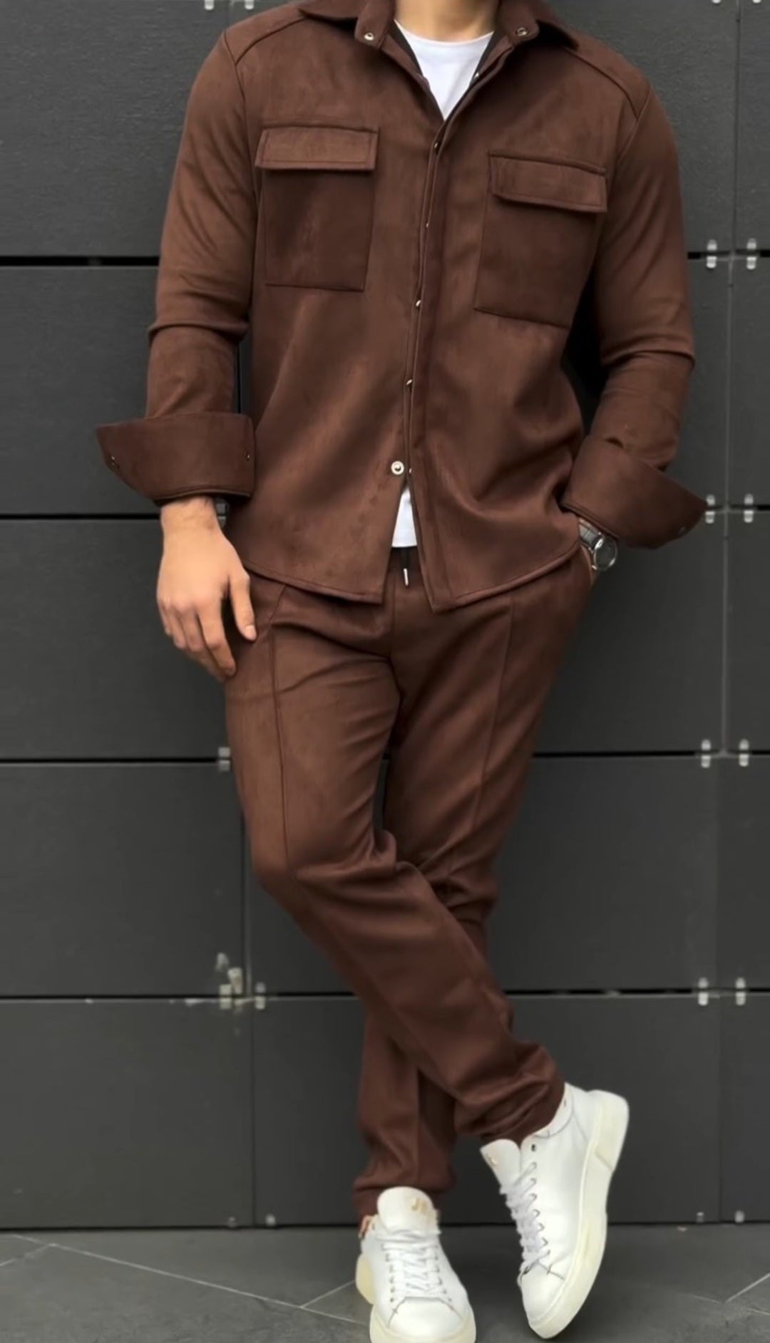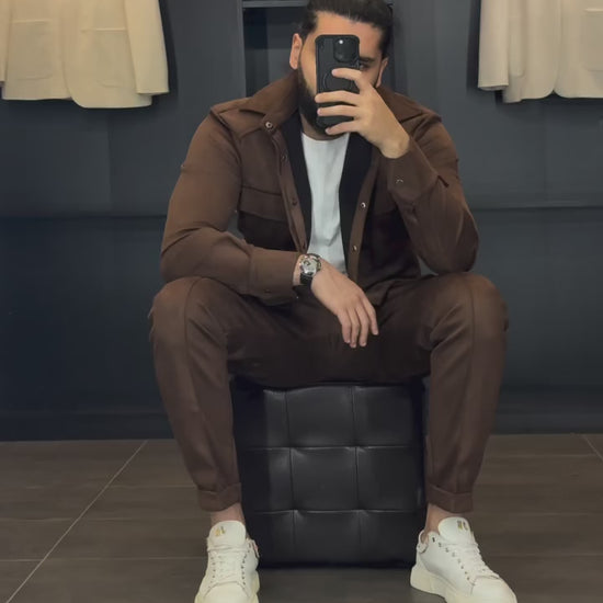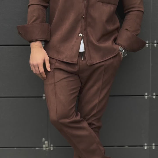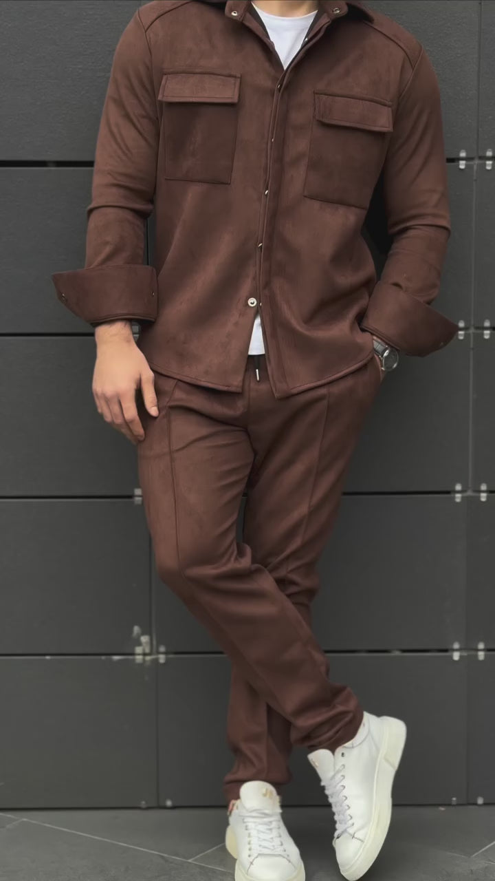 ✅ози мъжки комплект излъчва модерна елегантност и небрежен финес. Изработен от мек материал с вид на велур (suede), сетът се състои от риза тип overshirt с предни джобове и съчетан панталон с вталена кройка в топъл шоколадово-кафяв нюанс. Фината текстура и прецизната изработка придават изискан, но отпуснат вид — идеален за стилна градска визия.